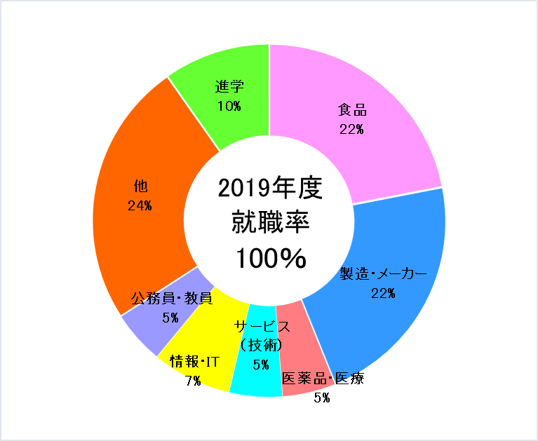 就職先は、食品関連、製薬・医療関連を中心に、多様な業種に広がっています。生命科学コースで学んだ知識と技術を活かし、食品開発や医薬品のバイヤー、環境関連の検査技師といった職種に付く学生も多く、更に高い専門知識や研究開発能力の習得を目指して、大学院に進学する学生もいます。また教員免許(中学・高校理科)を取得出来ますので、これを活かして教員に就職する学生もいます。