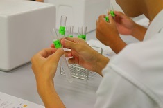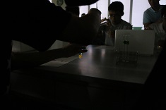 サイエンスコミュニケーター(SC)による体験実験のコーナーでは、酵素反応である『ルシフェラーゼ反応』の実験を行っていただきました。ルシフェラーゼ反応はホタルが発光するときにはたらいている酵素による反応です。酵素(タンパク質)なので、温度によって発光の様子が異なり、常温では強く発光しますが、70℃では全く光りません。また0℃のものは、手で温めると発光がみられるようになることなどが確認できました。