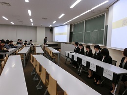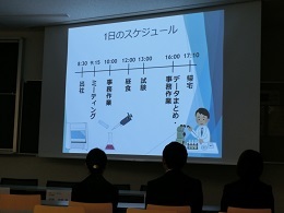 今回は、『化学』『サービス(検査受託)』『製薬』『食品』『半導体』の5つの業界で活躍する新入社員の皆さまに、それぞれの業界についての説明や、携わっている仕事の内容、働き方、やりがいなど、また社会人となって感じたこと・変わったことなどをお話ししていただきました。とても分かりやすくお話ししてくださり、参加した学生たちも各業界のイメージを明確にすることができたのではないかと思います。また、入社一年目の先輩方からのお話は、これから就職活動を開始する3年生にとってとても貴重なものとなりました。