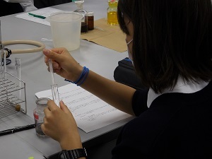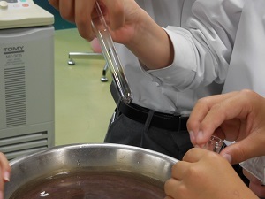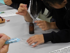 9人の生徒が参加し、『金属イオン1属の分類』の実験を行いました。さらに追加で実施した「銀イオンから銀の鏡を作る反応」である銀鏡反応にも挑戦しました。最初は実験がおぼつかない様子もありましたが、銀鏡反応の実施のころには、手際が良くなり、きれいな鏡ができて歓声をあげたり、お互いに出来栄えを比べあったりしていました。銀鏡ができた試験管は、お土産として持ち帰っていただきました。
