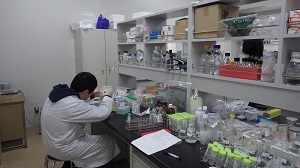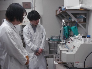 私たちの研究室では、藻類の脂質(オイル)産生について研究しています。たくさんの藻類の中でも、燃料として使用できる、ハプト藻の中で5種しか産生されないアルケノンについて研究をしています。アルケノンは、古海水温の推定にも使われるバイオマーカーです。その中で私たちは、藻類の遺伝子組み換えによるオイル産生能力の向上を目指しています。将来的に実用性のある次世代エネルギーの確立を願って、日々の研究に勤しんでいます。