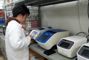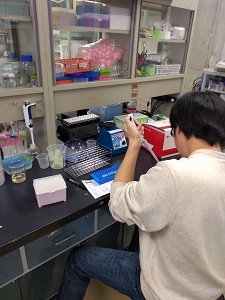 海老原研究室では、動物の味覚と性決定遺伝子について遺伝子レベルで研究しています。私が行っている動物の味覚研究では、人間が甘いと感じる味覚を実は猫は失っており、砂糖を舐めても甘いと感じていないなど、他の動物達が人間と同じように甘味、うま味、苦味、塩味、酸味といった基本5味を知覚しているのかどうかを研究しています。味覚の研究は分野として新しく、まだまだ解明されていないことが多い分野ですが、動物達の味覚を解明することでその動物の食性や生息環境、または進化の系統や分岐による違いが判明したり、動物の種別に応じて最適な食餌の提供が行えるようになるなど、様々な面で活躍することが期待される分野だと考えています。自分の研究もまた、将来的に役立つ発見の一部になること願って日々の実験に取り組んでいます。