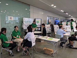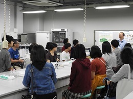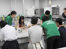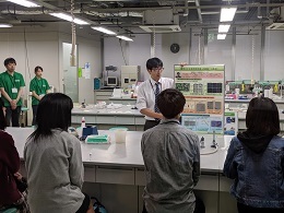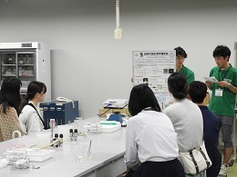 研究・実験紹介ツアーでは27名の方々にご参加いただきました。海老原先生による生命学系についての説明と新家先生と学生による全研究室の紹介、実際の研究室の見学を行いました。また、尾之上先生によるDNAの講義を受けた後にサイエンスコミュニケーター(SC)と共に鶏レバーからDNAを抽出する実験を行いました。生命学系の相談ブースの方にも沢山の方々にご来場していただきました。